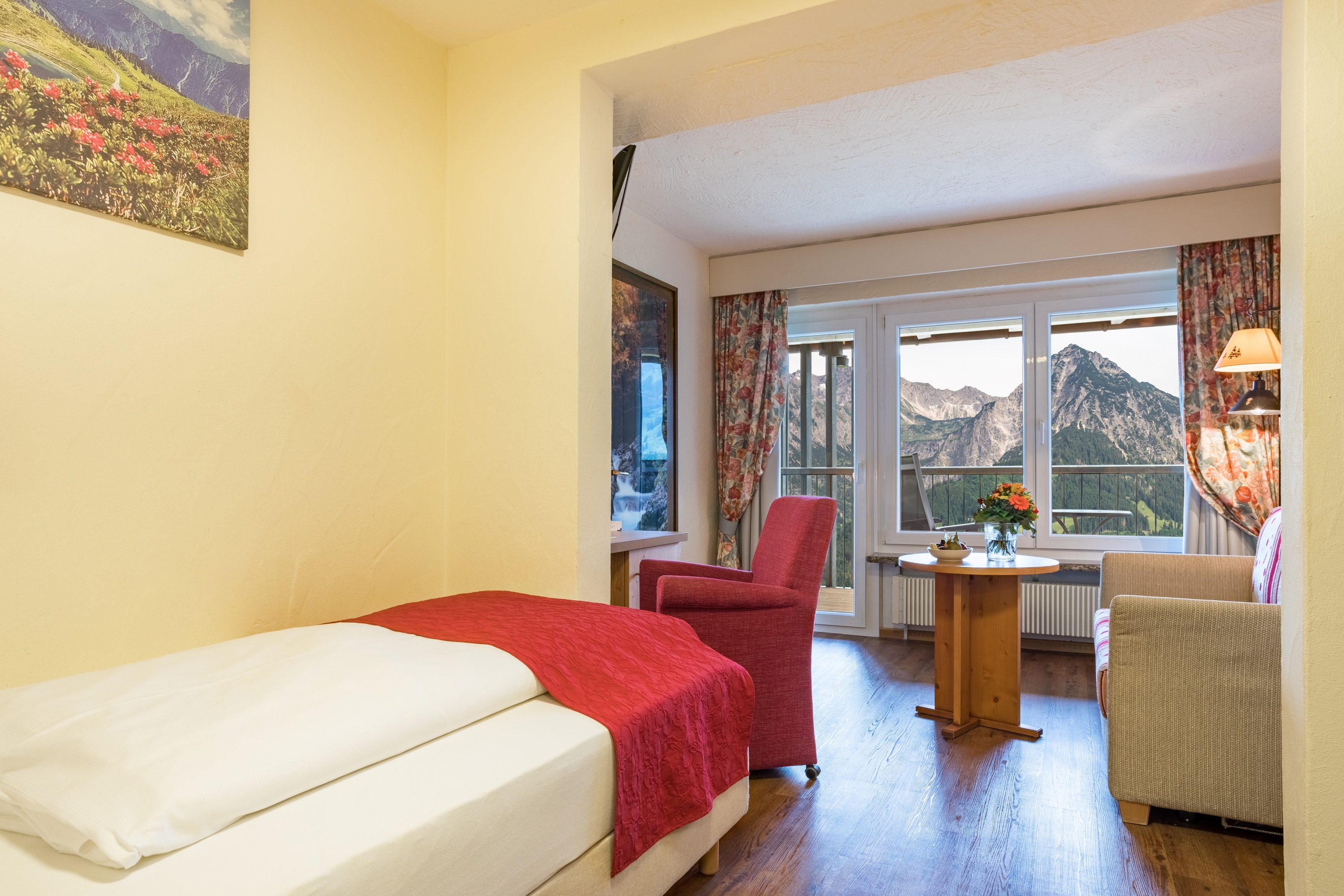 Klein, ruhig und mit besonderem Ausblick: Dieses helle Einzelzimmer empfängt Dich mit harmonischer Gestaltung und viel Licht. Vom Balkon zur Südostseite blickst Du direkt zum Nebelhorn und startest den Tag mit eindrucksvollem Bergpanorama – ein perfekter Rückzugsort für Deine persönliche Auszeit.